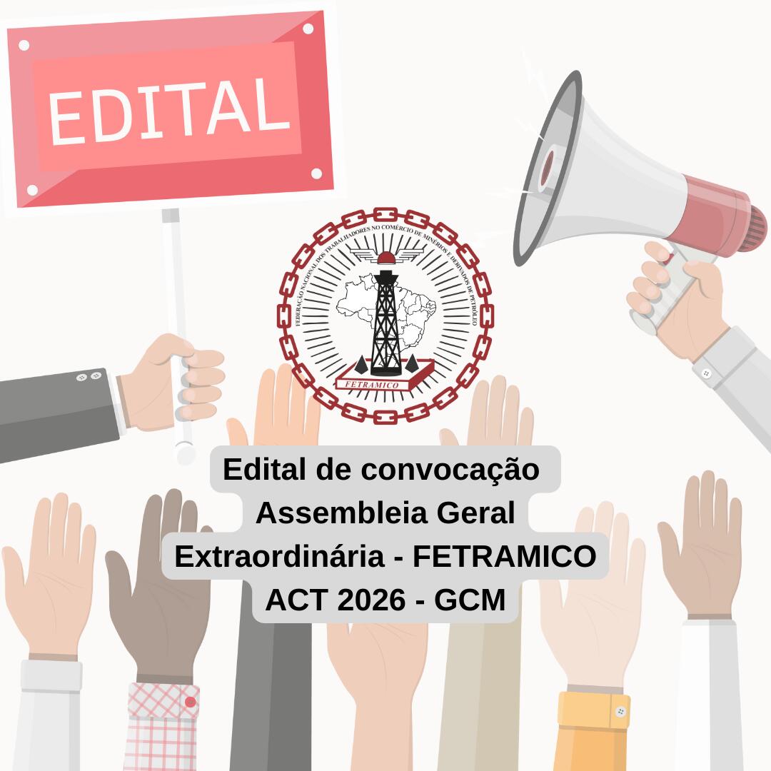 Pelo presente Edital a FEDERAÇÃO NACIONAL DOS TRABALHADORES NO COMÉRCIO DE MINÉRIOS E DERIVADOS DE PETRÓLEO – FETRAMICO convoca os (as) trabalhadores (as) da categoria nas areas inorganizadas, principalmente os empregados na Empresa GCM COMÉRCIO DE LUBRIFICANTES nos estados do Acre e Rondônia para participar da Assembleia Geral Extraordinária Virtual- Age-V a ser realizada no dia 13 de Fevereiro de 2026 (sexta-feira),