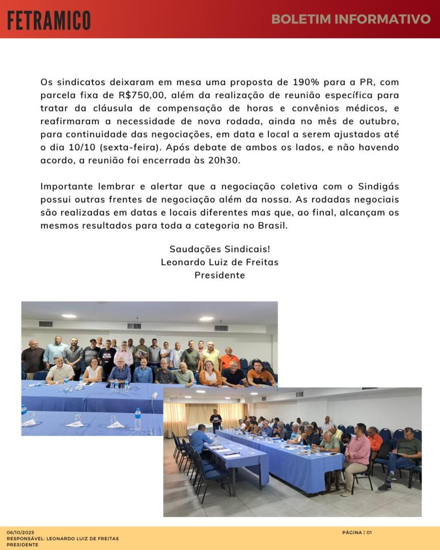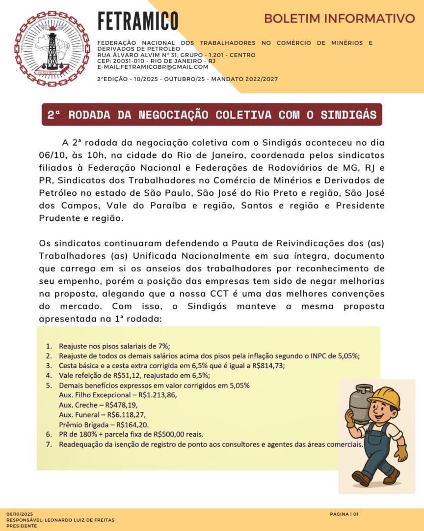 19 de novembro de 2025Comunicamos aos nossos filiados que a Federação Nacional enviou o Ofício 033/2025 ao SINDIGÁS, para o Presidente Sérgio Vital Bandeira de Mello, após registrar em ata da 2ª rodada o pedido e a importância de que uma nova rodada aconteça ainda em outubro. Aguardamos retorno até 10/10.
